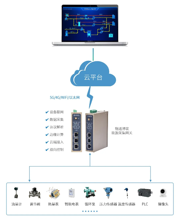 通過部署能源數(shù)采網(wǎng)關(guān),能夠?qū)崟r采集流量計、智能電表、熱量表、稱重儀器、循環(huán)泵、調(diào)節(jié)閥、溫度傳感器、壓力傳感器等設備,將供熱量、耗汽量、耗水量、耗電量、燃料消耗量、余熱利用量、溫度、壓力等數(shù)據(jù)對接到智慧供熱能源管理平臺中,從而將熱源、管網(wǎng)、中繼泵站、熱力站等納入統(tǒng)一的節(jié)能評價系統(tǒng)中,實現(xiàn)對能源的監(jiān)測、管理、統(tǒng)計與分析,助力提高能源利用效率與管理水平,實現(xiàn)節(jié)能、降本與增效的全面發(fā)展。